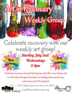 Join us for some fun in recovery! Lets get our hands dirty and put paint to canvas! In Art in Recovery we will create various projects through the use of paint, pencil, watercolor, clay and even some DIY! This is a weekly meeting with a rotating theme each week.
